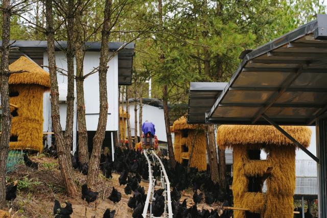 走进石塘林下养殖基地,一处处新质场景、发展变化呈现在眼前。新建的黑鸡产品、养殖投料轨道运输专用线3公里,“小火车”不时穿梭于林间;客户在手机上能通过投运的认养认购云养鸡系统看到自己认养认购的旧院黑鸡在林中活动情况;搭建的12个电商直播间格外醒目,100多座“别墅”式大小鸡舍星罗棋布,新建的“百里坡旧院黑鸡”地标性活动广场,成为了基地的一道道靓丽风景线。去年,农场扩大利用林下养殖面积达到6000余亩,出栏黑鸡、黑猪、产蛋同比分别增加了5万只、200头、100万枚;去年,又有近10名大学生和新型农民来到农场工作,团队不断壮大,林下经济发展正成为乡村人才振兴的重要赛道。